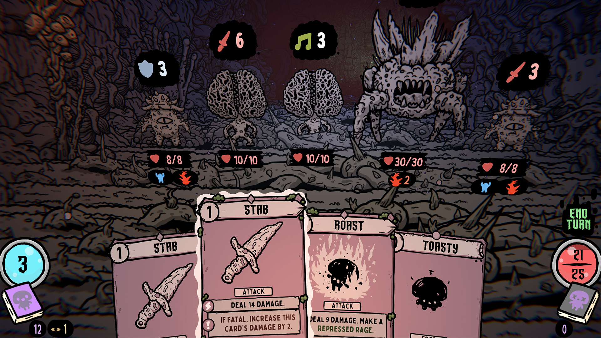 - Targeting pips on top of cards to indicate if they will effect 1 enemy, all enemies, 1 card, all cards in hand or the player.